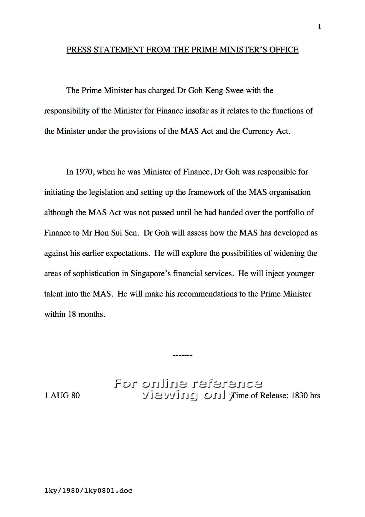 Statement by Mr Lim Kim San the Minister of Finance entitled "Common Currency and Banking System", Singapore Parliament Reports, Vol 25, Issue No 5, Sitting date: 26 August 1966 at Col 267