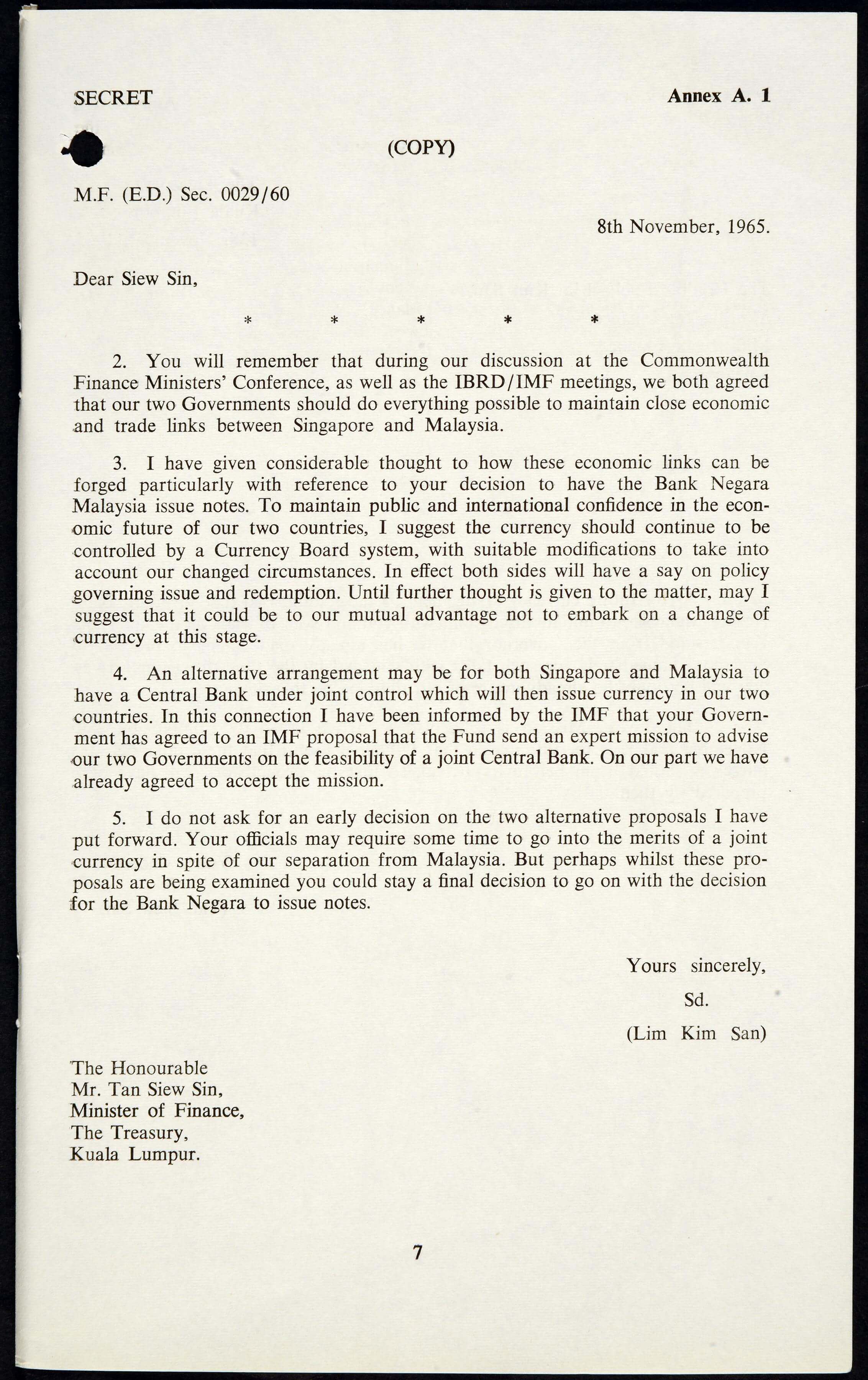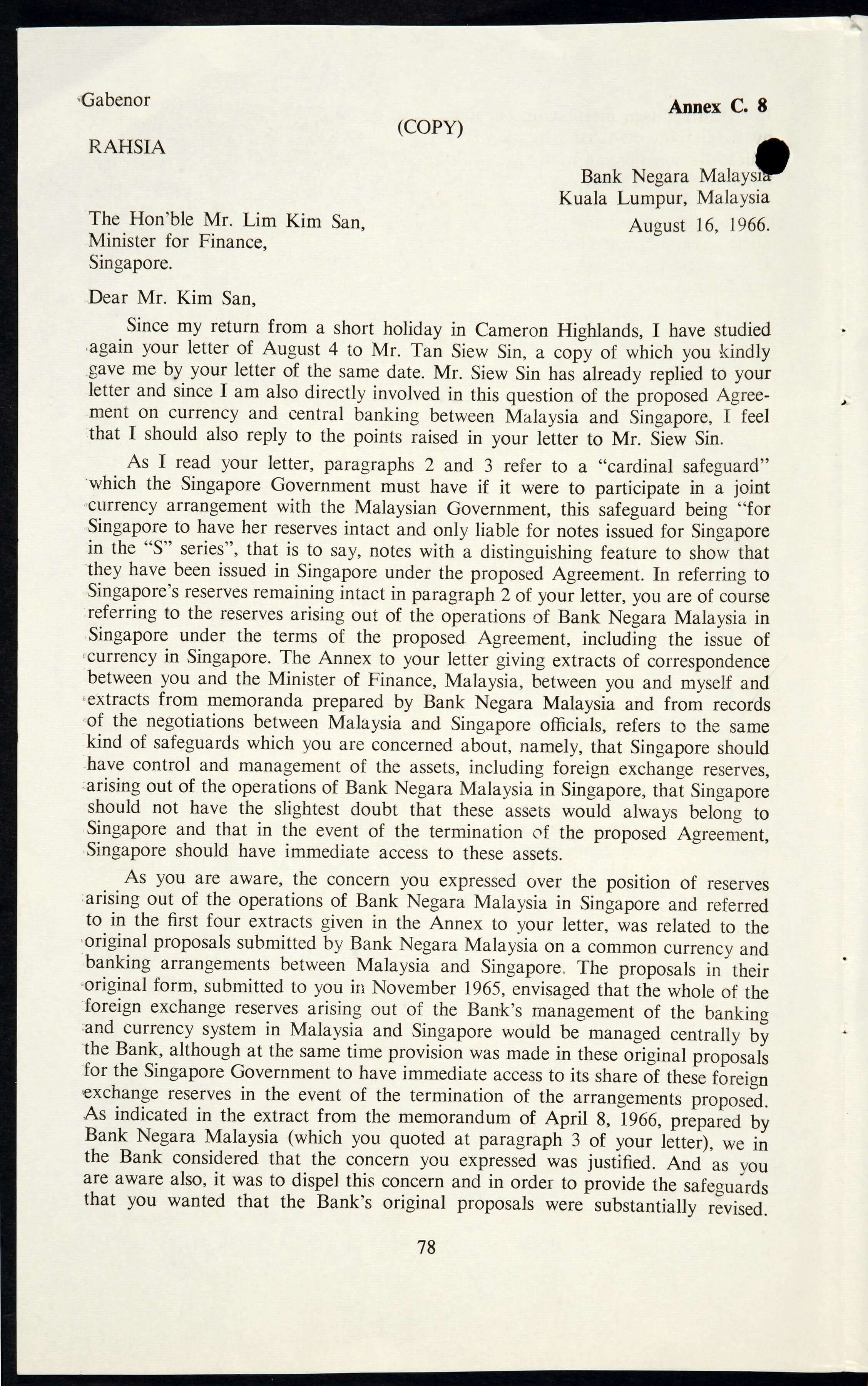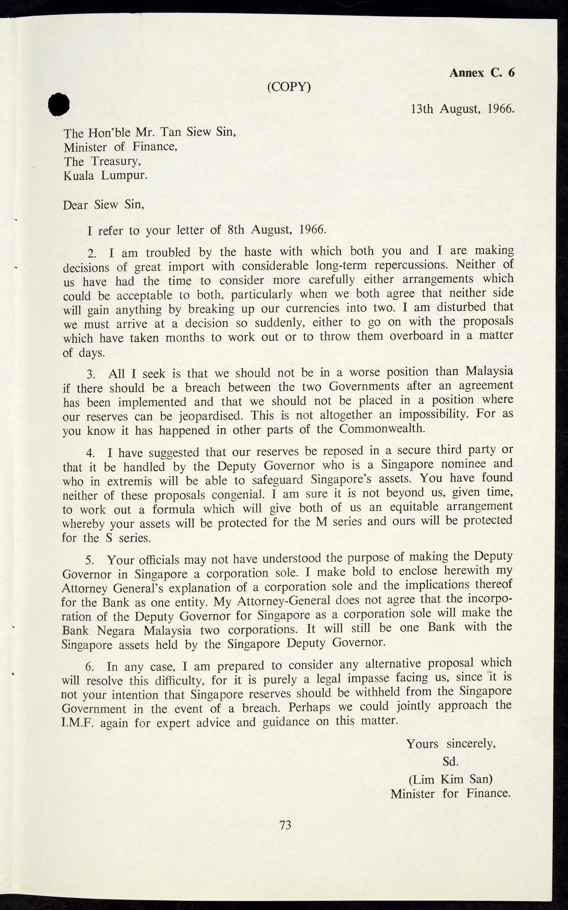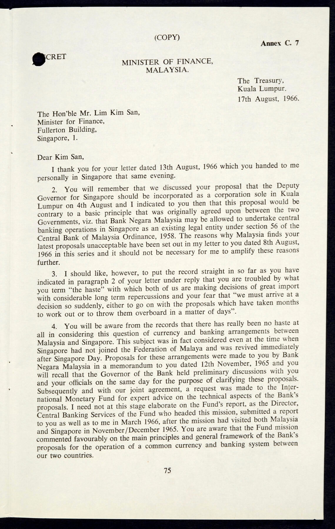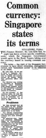 Statement by Mr Lim Kim San the Minister of Finance entitled "Common Currency and Banking System", Singapore Parliament Reports, Vol 25, Issue No 5, Sitting date: 26 August 1966 at Col 267