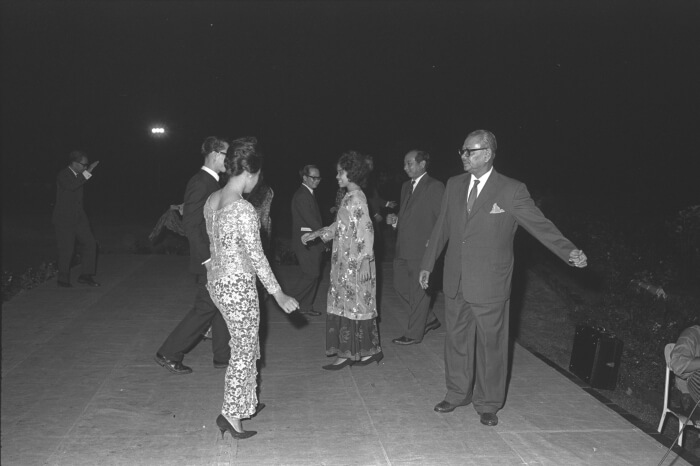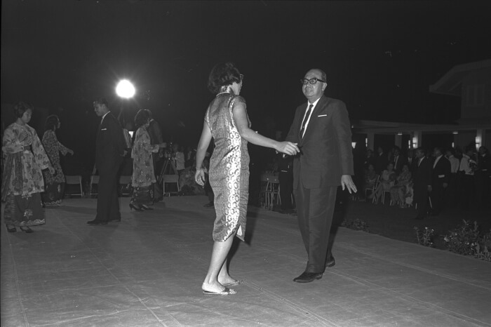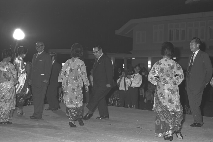 Dignitaries such as Malaysian Prime Minister Tengku Abdul Rahman and Dr Goh Keng Swee dancing the joget at the opening of Rumah Temasek in KL